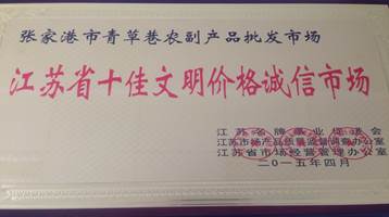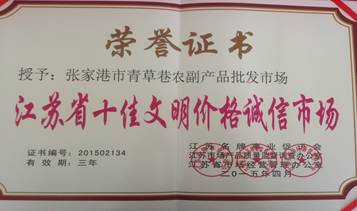 为进一步推进诚信江苏建设和社会信用体系建设,全面落实党的十八大提出的加强政务诚信、商务诚信、社会诚信和司法公信建设的战略部署,根据省委、省政府加快构建社会诚信体系的新要求,2015年4月,在江苏名牌事业促进会、江苏省社会信用评估委员会、江苏省市场经营管理办公室开展的“江苏省十佳文明价格诚信市场”评选工作中,青草巷市场榜上有名。