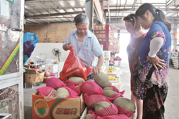 生意做得久了,陶桂岐用诚信经营、价廉物美吸引了近百名老顾客,有每天前来光顾的餐饮店老板,也有专程从市区赶来的普通市民。记者采访时,就有两名老顾客来到陶桂岐的摊位,“哈密瓜多少钱一斤?给我来3个。”“1块8毛一斤。”陶桂岐熟练地挑选好水果,放在市场统一配备的“五统一”秤上称重。“总共25块9毛,付25块就好了。”陶桂岐主动给顾客抹了零,这也是他多年的经营习惯。“陶老板脾气好,待人客气,价格公道。”两名顾客表示,她们是特意从市区赶来的,“买水果我们认准陶老板的摊位。”