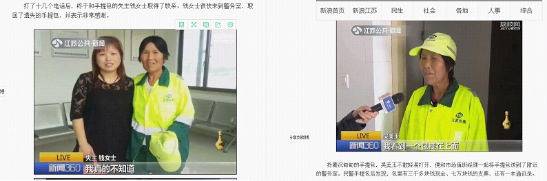 10月8日上午,市场保洁单位员工吴美玉在粮油区女厕所打扫卫生时,发现了一个红色的手提包。吴美玉及时向保洁单位负责人王红梅汇报了情况,并一起将手提包送到了市场警务室。民警打开手提包后发现,包里有三千多块钱现金、七万块钱的支票、银行卡等,还有一本通讯录。通过通讯录及时联系上了失主钱女士,钱女士取回了遗失的手提包,并表示非常感谢。10月9日、13日,张家港广播电视台(第一视线)、张家港日报社,苏州市广播电视台分别对这一事件进行了采访报道。